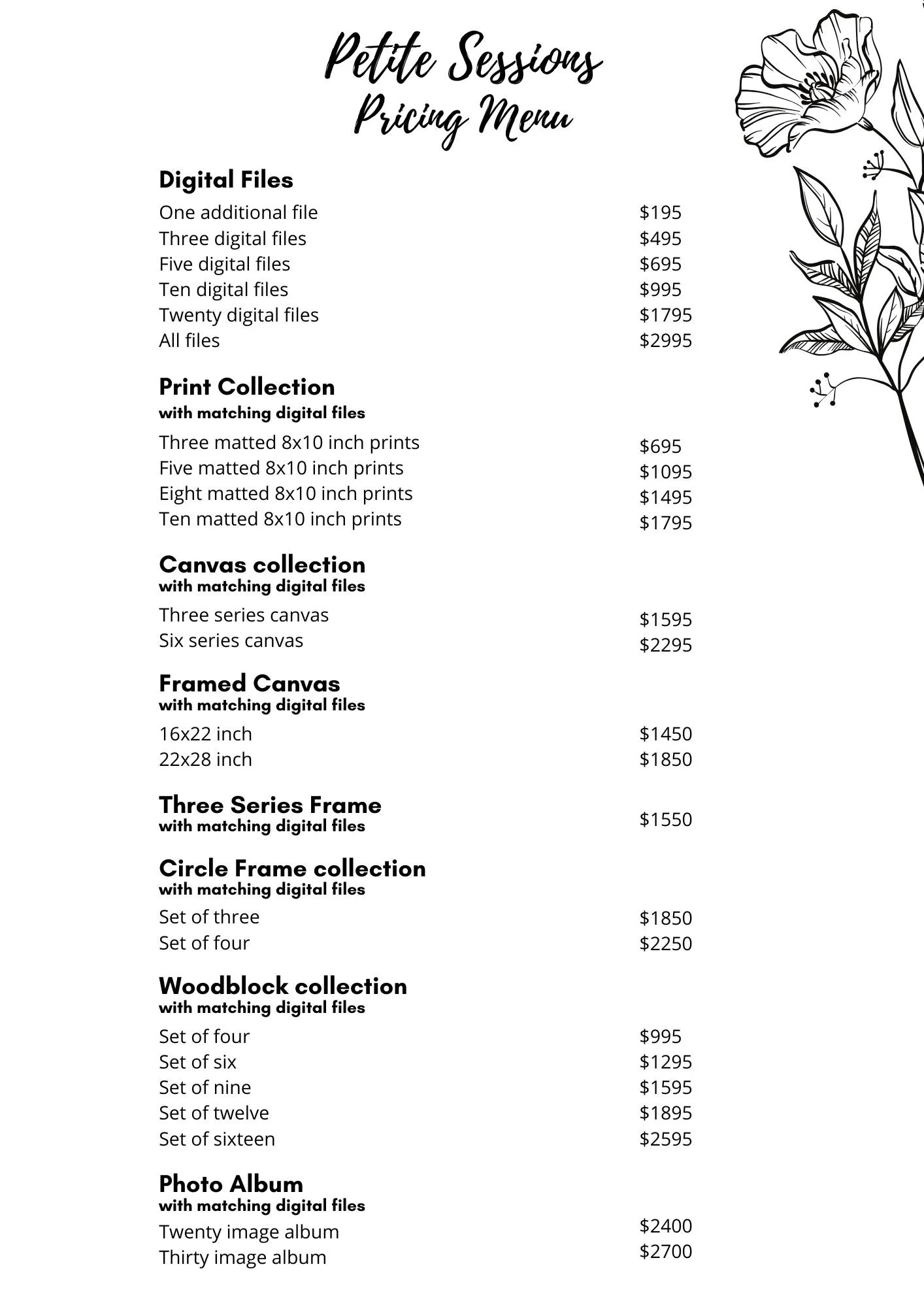 Should you wish to purchase more than what is included, a range of additional digital files and artwork are available at special Petite Session pricing, shown here.